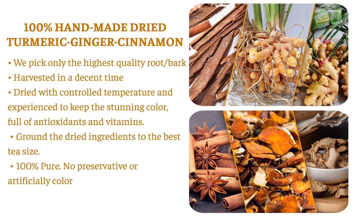 ✅ FROM FRESHLY PICKED, NATURALLY DRIED TURMERIC, GINGER & CINNAMON: The best Turmeric, Ginger and Cinnamon are picked at a decent time, washed with fresh water, dried in the sun, ground with years of experience to the best tea size, and carefully packed to preserve the flavor and distinct aromatic effect.