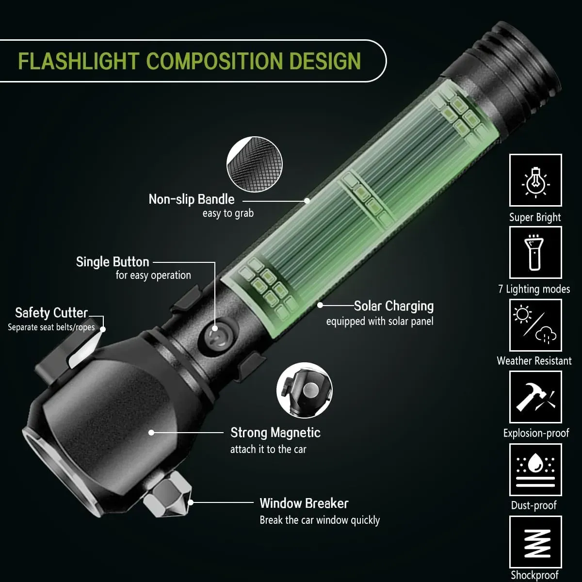 Rechargeable solar flashlight, multi-function LED tactical flashlight, glass breaking, seat belt cutter